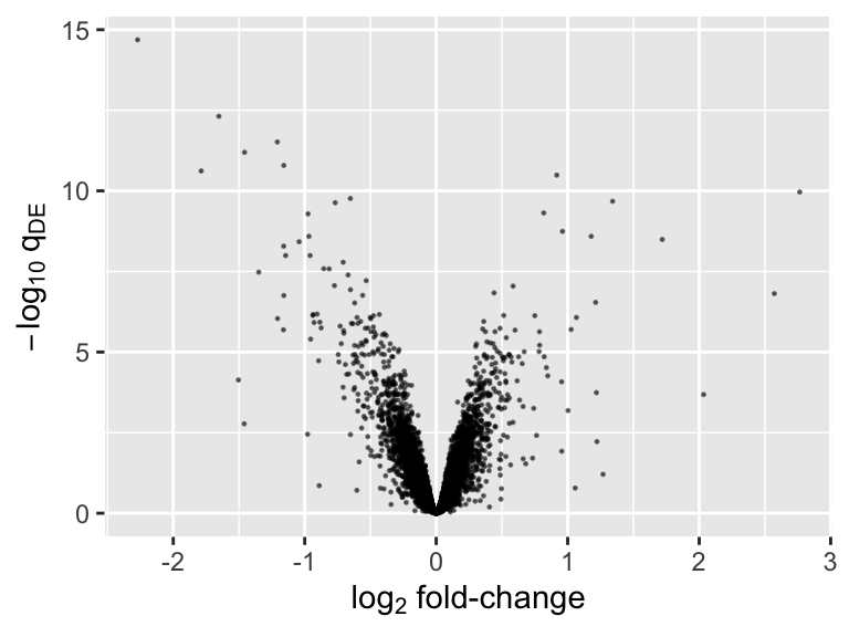 ggplot(deLimma) + geom_point(aes(x = logFC, y = -log10(adj.P.Val)), size = 0.2, alpha = 0.5) + labs(x = expression(log[2]*' fold-change'), y = expression(-log[10]*' '*q[DE]))