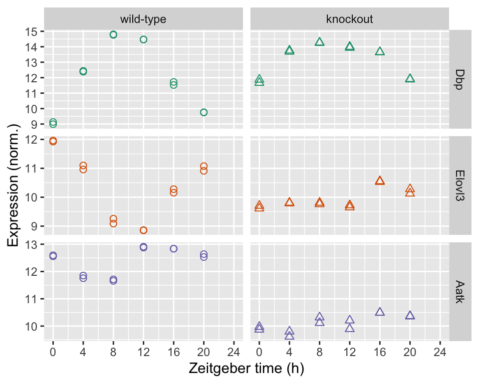geneIdsNow = c(rhyLimmaSummary$geneId[1], drLimma$geneId[1], deLimma$geneId[1]) geneSymbolsNow = unname(getSYMBOL(geneIdsNow, 'org.Mm.eg.db')) df = data.table(t(emat[geneIdsNow, ])) setnames(df, geneSymbolsNow) df[, sample := colnames(emat[geneIdsNow, ])] df = merge(df, sm[, .(sample, cond, time)], by = 'sample') df = melt(df, measure.vars = geneSymbolsNow, variable.name = 'geneSymbol', value.name = 'expr') levels(df$geneSymbol) = geneSymbolsNow ggplot(df) + facet_grid(geneSymbol ~ cond, scales = 'free_y') + geom_point(aes(x = time, y = expr, shape = cond, color = geneSymbol), size = 2) + labs(x = 'Zeitgeber time (h)', y = 'Expression (norm.)') + scale_shape(solid = FALSE, guide = FALSE) + scale_color_brewer(type = 'qual', palette = 'Dark2', guide = FALSE) + scale_x_continuous(limits = c(0, 24), breaks = seq(0, 24, 4))